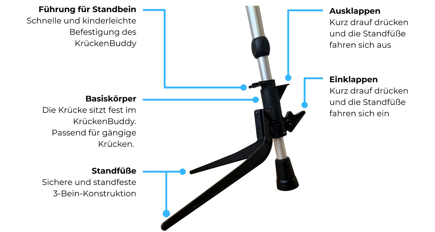 Die ausklappbaren Standfüße verwandeln die Krücke in eine stabile 3-Bein-Konstruktion, sodass sie selbstständig und sicher stehen bleibt.